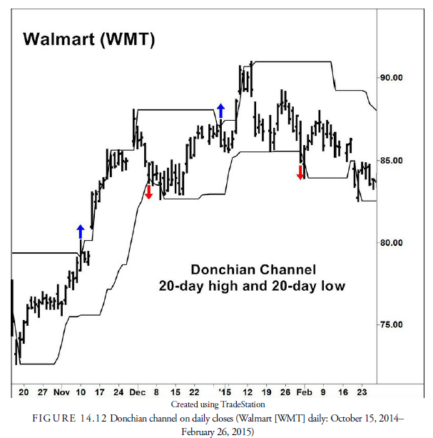 Channels have been described as something simpler than two parallel lines. For example, in Chapter 12, we mentioned the Donchian channel method that has been so successful even though it’s been widely known for many years. Signals occur with the Donchian channel when the breaking above or below a high or low over some past period occurs (see Figure 14.12). This method does not require the construction of a trend line; the only requirement is a record of the highs and lows over some past period. In the case of the Donchian channel method, the period was four weeks (20 days), and the rule was to buy when the price exceeded the highest level over the past four weeks and sell short when the price declined below the lowest low over the past four weeks. Such systems are usually “stop and reverse” systems that are always in the market, either long or short. As is likely imagined, the channel systems are more commonly used in the commodities markets where long and short positions are effortless and prices tend to trend much longer.