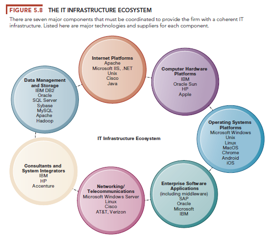 IT infrastructure today is composed of seven major components. Figure 5.8 illustrates these infrastructure components and the major vendors within each component category. These components constitute investments that must be coordinated with one another to provide the firm with a coherent infrastructure.