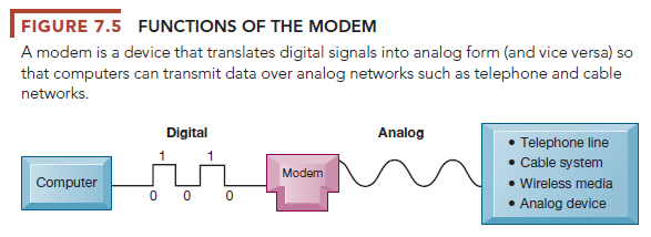 A digital signal is a discrete, binary waveform rather than a continuous waveform. Digital signals communicate information as strings of two discrete states: 1 bits and 0 bits, which are represented as on-off electrical pulses. Computers use digital signals and require a modem to convert these digital signals into analog signals that can be sent over (or received from) telephone lines, cable lines, or wireless media that use analog signals (see Figure 7.5). Modem stands for modulator-demodulator. Cable modems connect your computer to the Internet by using a cable network. DSL modems connect your computer to the Internet using a telephone company’s landline network. Wireless modems perform the same function as traditional modems, connecting your computer to a wireless network that could be a cell phone network or a Wi-Fi network.