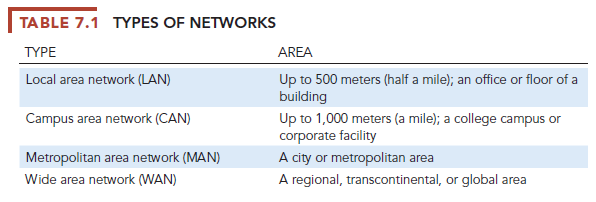 There are many kinds of networks and ways of classifying them. One way of looking at networks is in terms of their geographic scope (see Table 7.1).