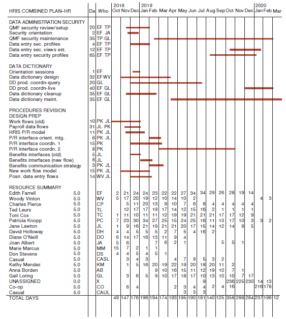 The Gantt chart in this figure shows the task, person-days, and initials of each responsible person as well as the start and finish dates for each task. The resource summary provides a good manager with the total person-days for each month and for each person working on the project to manage the project successfully. The project described here is a data administration project.