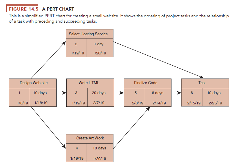 Although Gantt charts show when project activities begin and end, they don’t depict task dependencies, how one task is affected if another is behind schedule, or how tasks should be ordered. That is where PERT charts are useful. PERT stands for “Program Evaluation and Review Technique,” a methodology developed by the U.S. Navy during the 1950s to manage the Polaris submarine missile program. A PERT chart graphically depicts project tasks and their interrelationships. The PERT chart lists the specific activities that make up a project and the activities that must be completed before a specific activity can start, as illustrated in Figure 14.5.