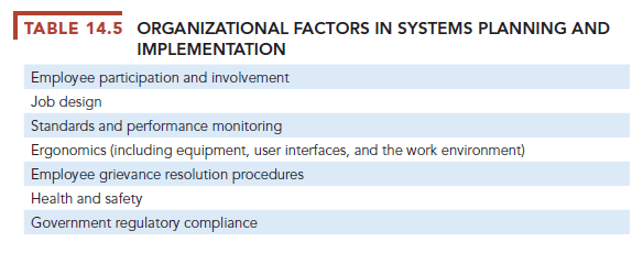 Areas where users interface with the system require special attention, with sensitivity to ergonomics issues. Ergonomics refers to the interaction of people and machines in the work environment. It considers the design of jobs, health issues, and the end-user interface of information systems. Table 14.5 lists the organizational dimensions that must be addressed when planning and implementing information systems.