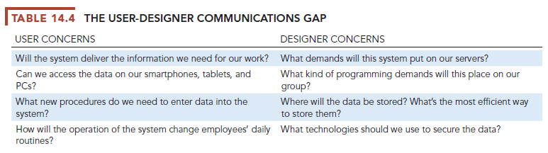 These differences are illustrated in Table 14.4, which depicts the typical concerns of end users and technical specialists (information systems designers) regarding the development of a new information system. Communication problems between end users and designers are a major reason why user requirements are not properly incorporated into information systems and why users are driven out of the implementation process.