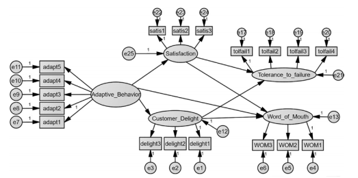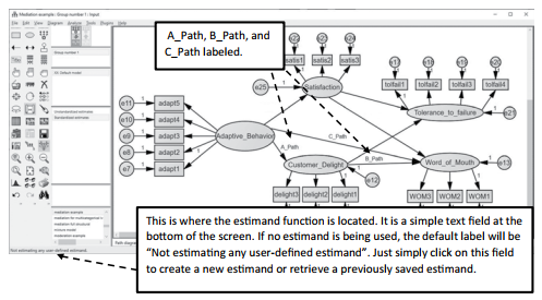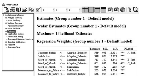 Based on these results, we can conclude that the influence of Adaptive Behavior to Posi- tive Word of Mouth flows only through customers’ perceptions of delight. If you have more relationships to test, you can label those parameters and make adjustments in the estimands function. By using the estimands function, you have the ability to isolate an indirect effect even when multiple mediators are present.