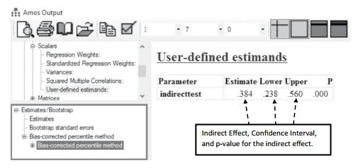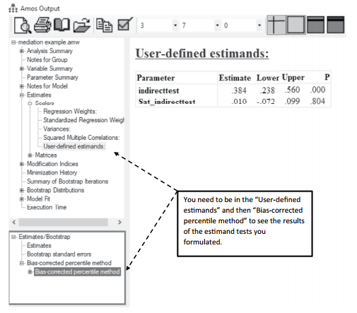 With the “User-defined estimands” option selected, you can now go to the bootstrap analysis and selected the “Bias-corrected percentile method” option. This will give you the indirect effect, confidence interval, and significance for the indirect effect. Note that if you do not have the “User-defined estimands” option selected, all the bootstrap analysis will be grayed out.