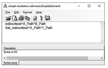 Let’s choose to define a new estimand option.The estimand pop-up window will appear. In the syntax window, we need to specify how AMOS should analyze the indirect effect. Remem- ber that earlier, I said the indirect effect is the A path multiplied by the B path. Let’s call our new indirect analysis simply “indirecttest”, and then you will put an equal sign and specify the labels for the paths of the indirect effect you want to test. We are going to multiply the path labeled “A_Path” by the path labeled “B_Path”. See Figure 6.16. After you have specified the function in the window, you need to make sure you do not have any syntax errors.You will need to select the check syntax icon