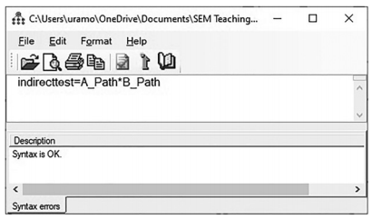 Let’s choose to define a new estimand option.The estimand pop-up window will appear. In the syntax window, we need to specify how AMOS should analyze the indirect effect. Remem- ber that earlier, I said the indirect effect is the A path multiplied by the B path. Let’s call our new indirect analysis simply “indirecttest”, and then you will put an equal sign and specify the labels for the paths of the indirect effect you want to test. We are going to multiply the path labeled “A_Path” by the path labeled “B_Path”. See Figure 6.16. After you have specified the function in the window, you need to make sure you do not have any syntax errors.You will need to select the check syntax icon