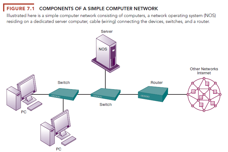 If you had to connect the computers for two or more employees in the same office, you would need a computer network. In its simplest form, a network consists of two or more connected computers. Figure 7.1 illustrates the major hardware, software, and transmission components in a simple network: a client computer and a dedicated server computer, network interfaces, a connection medium, network operating system software, and either a hub or a switch.