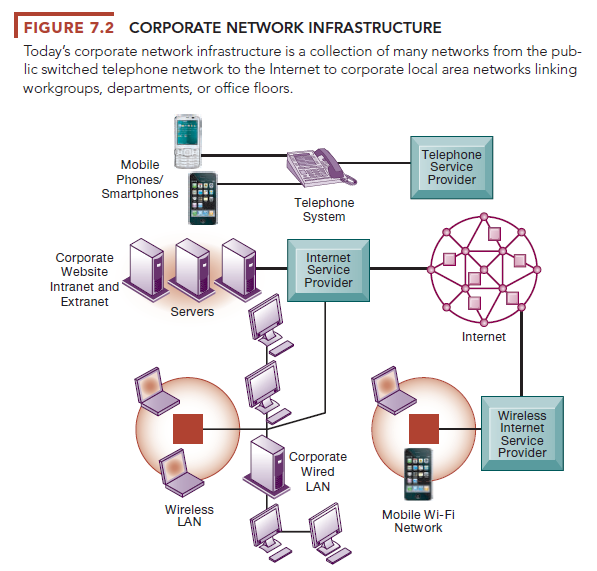 Figure 7.2 provides an illustration of these more-complex, larger-scale corporate-wide networks. Here the corporate network infrastructure supports a mobile sales force using mobile phones and smartphones, mobile employees linking to the company website, and internal company networks using mobile wireless local area networks (Wi-Fi networks). In addition to these computer networks, the firm’s infrastructure may include a separate telephone network that handles most voice data. Many firms are dispensing with their traditional telephone networks and using Internet telephones that run on their existing data networks (described later).