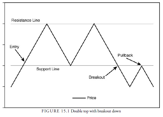 Pullbacks occur when prices break out downward and then “pull back” to their breakout level. Throwbacks occur when prices break out upward and then “throw back” to their breakout level (Edwards and Magee, revised 2007). Figure 15.1 shows an example of a pullback. Neither a pullback nor a throwback is easily or precisely defined, but you know one when you see it. The interesting aspect of this price behavior is that invariably a pullback or throwback will decrease the extent of the eventual move in the direction of the breakout. Thus, although each may provide a second opportunity for action at the breakout level, the subsequent rise or fall generally will be less than if there were no pullback or throwback. Tactically, this implies that a breakout should be acted upon immediately; waiting for the retracement will diminish profitability, and you may very likely miss the entire price move.
