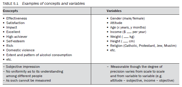 An image, perception or concept that is capable of measurement – hence capable of taking on different values – is called a variable. In other words, a concept that can be measured is called a variable. According to Kerlinger, ‘A variable is a property that takes on different values. Putting it redundantly, a variable is something that varies … A variable is a symbol to which numerals or values are attached’ (1986: 27). Black and Champion define a variable as ‘rational units of analysis that can assume any one of a number of designated sets of values’ (1976: 34). A concept that can be measured on any one of the four types of measurement scale, which have varying degrees of precision in measurement, is called a variable (measurement scales are discussed later in this chapter).