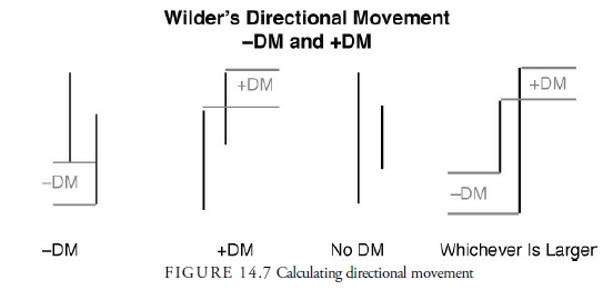 One of the great contributions to the concept of trend and direction is the concept of directional movement that Welles Wilder (1978) developed in his book New Concepts in Technical Trading Systems. Wilder compared a stock’s trading range for one day with the trading range on the previous day to measure trend. Positive directional movement occurred when the high for a day exceeded the high of the previous day. As shown in Figure 14.7, the amount of positive directional movement (+DM) is the day’s high minus the previous day’s high, or the vertical distance between the top of the two bars. If the low for the day is less than the previous day’s low, negative directional movement occurs. The value of the negative directional movement (-DM) is the difference between the two lows.