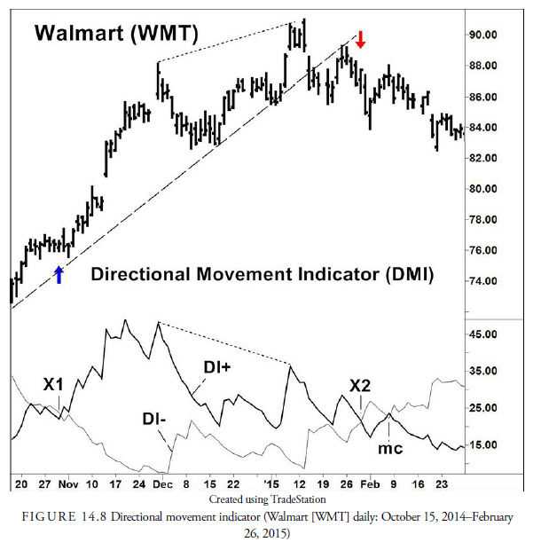 Figure 14.8 shows 14-day DIs for Walmart (WMT). Looking at this chart, an analyst sees a number of hints about trend. First, when one DI is higher than the other, the trend is in the direction of that DI. For example, from early November through late January, the DI+ was above the DI-, indicating that a majority of the 14-day ATR excess for WMT was on the upside during that period. The first major crossover occurred in early October when the DI+ crossed above the DI- (marked with “X1”) indicating an upturn in the price trend, and the second occurred in late January when the DI- crossed above the DI+ (marked with “X2”) and warned us that the trend had reversed downward. This confirmed the earlier downward break of the trend line. Thus, the DMI crossover is an important signal in analyzing trends.