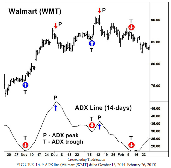 Fifth, ADX peaks and troughs provide valuable information about the price trend. When the ADX peaks, it often signals a peak or trough in prices. In Figure 14.9, peaks in the ADX (marked with arrows) show how closely they coincide with up or down reversals in price. Because their pinpointing the end of trends is so accurate, ADX peaks are used as trading signals to close trend positions.