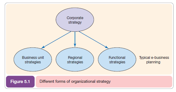 Johnson and Scholes (2006) note that organizations have different levels of strategy, particularly for larger or global organizations. These are summarized within Figure 5.1. They identify corporate strategy which is concerned with the overall purpose and scope of the organization, business unit strategy which defines how to compete successfully in a particular market and operational strategies which are concerned with achieving corporate and business unit strategies. Additionally, there are what can be described as functional strategies that describe how the corporate and business unit strategies will be operationalized in different functional areas or business processes. Functional or process strategies refer to marketing, supply chain management, human resources, finance and information systems strategies. Where does e-business strategy fit? Figure 5.1 does not show at which level e-business strategy should be defined, since for different organizations this must be discussed and agreed. We can observe that there is a tendency for e-business strategy to be incorporated within the functional strategies, for example within a marketing plan or logistics plan, or as part of information systems (IS) strategy. A danger with this approach is that e-business strategy may not be recognized at a higher level within organizational planning. A distinguishing feature of organizations that are leaders in e-business, such as Cisco, Dell, HSBC, easyJet and General Electric, is that e-business is an element of corporate strategy development.