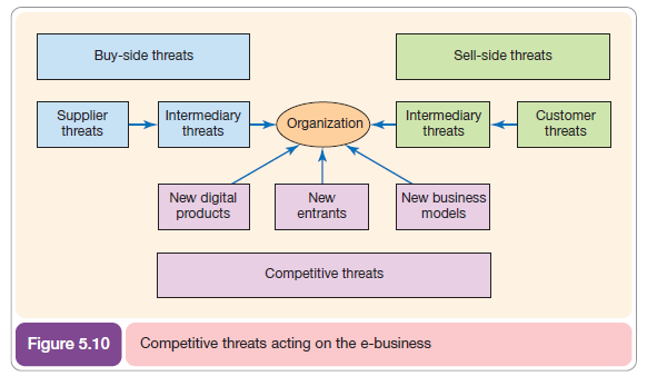 Placed in an e-business context, Figure 5.10 shows the main threats updated to place emphasis on the competitive threats applied to e-business. Threats have been grouped into buy-side (upstream supply chain), sell-side (downstream supply chain) and competitive threats. The main difference from the five forces model of Porter (1980) is the distinction between competitive threats from intermediaries (or partners) on the buy-side and sell-side. We will now review these e-business threats in more detail.