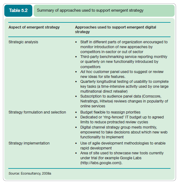 In reality, most organizational strategy development and planning processes have elements of prescriptive and emergent strategy reflecting different planning and strategic review timescales. The prescriptive elements are the structured annual or six-monthly budgeting process or a longer-term 3-year rolling marketing planning process. But, on a shorter timescale, organizations naturally also need an emergent process to enable strategic agility (introduced in Chapter 2) and the ability to rapidly respond to marketplace dynamics. Econsultancy (2008a) has researched approaches used to encourage emergent strategies or strategic agility (see Chapter 3) based on interviews with e-commerce practitioners. Some of the approaches used by companies to support emergent strategy development are summarized in Table 5.2.