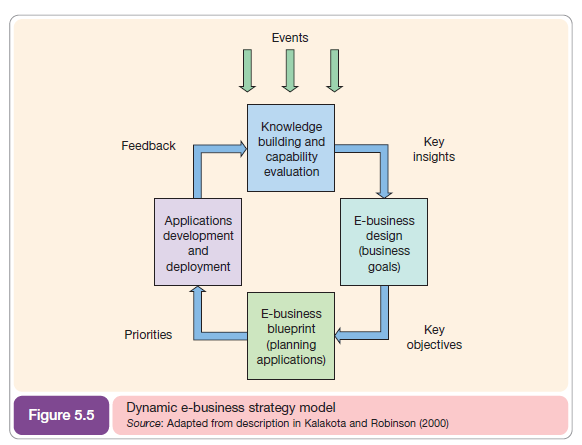Kalakota and Robinson (2000) recommend a dynamic emergent strategy process specific to e-business. The elements of this approach are shown in Figure 5.5. It essentially shares similar features to Figure 5.4, but with an emphasis on responsiveness with continuous review and prioritization of investment in new applications.
