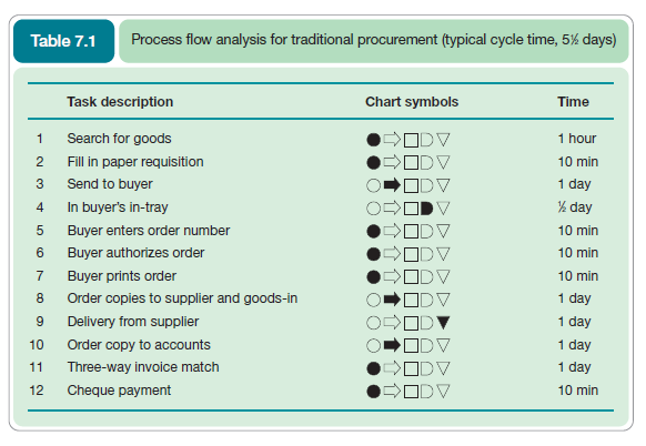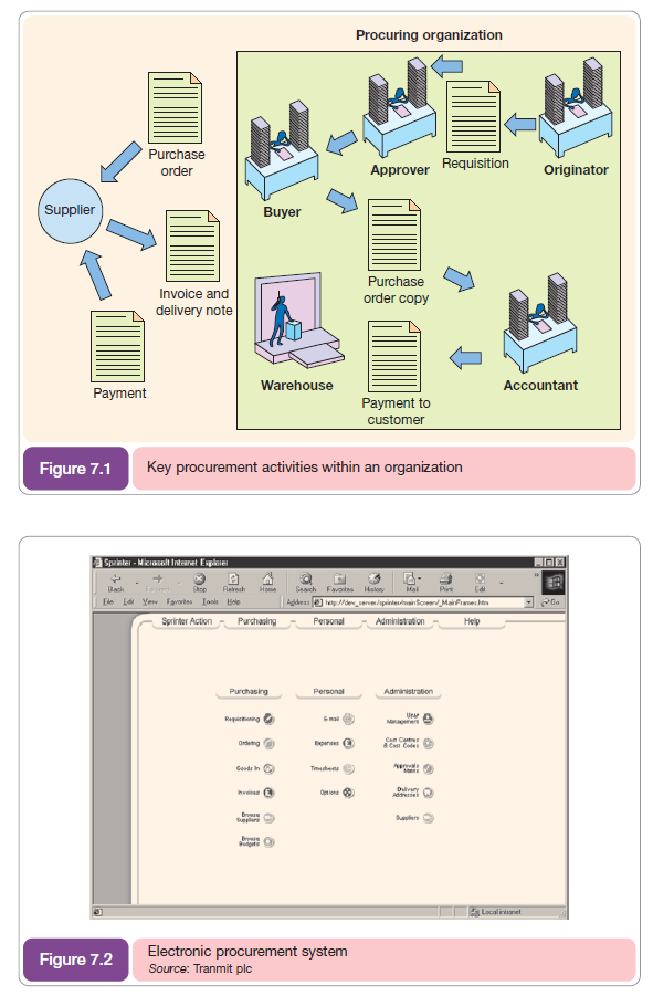 Before the advent of e-procurement, organizational purchasing processes had remained similar for decades. Table 7.1 highlights the paper-based process. It can be seen that it involves the end-user of the item selecting an item by conducting a search and then filling in a paper requisition form that is sent to a buyer in the purchasing department (often after authorization by a manager, which introduces further delay). The buyer then fills in an order form that is dispatched to the supplier. After the item is delivered, the item and a delivery note are usually reconciled with the order form and an invoice and then payment occurs. Procurement also includes the transport, storage and distribution of goods received within the business – this is referred to as ‘inbound logistics’. Activity 7.1 explains how the procurement process can be simplified through e-procurement.