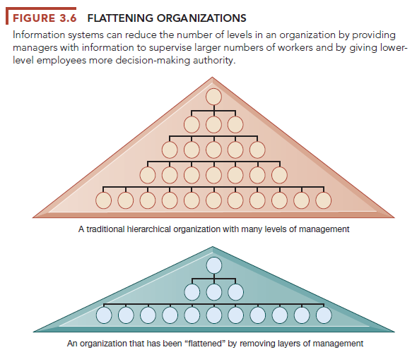 Behavioral researchers have theorized that information technology facilitates flattening of hierarchies by broadening the distribution of information to empower lower-level employees and increase management efficiency (see Figure 3.6). IT pushes decision-making rights lower in the organization because lower-level employees receive the information they need to make decisions without supervision. (This empowerment is also possible because of higher educational levels among the workforce, which give employees more capabilities to make intelligent decisions.) Because managers now receive so much more accurate information on time, they become much faster at making decisions, so fewer managers are required. Management costs decline as a percentage of revenues, and the hierarchy becomes much more efficient.
