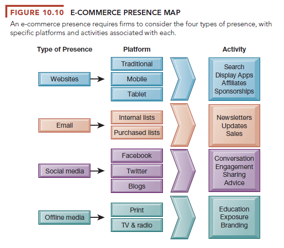 Figure 10.10 illustrates four kinds of e-commerce presence: websites, email, social media, and offline media. You must address different platforms for each of these types. For instance, in the case of website presence, there are three platforms: traditional desktop, tablets, and smartphones, each with different capabilities. Moreover, for each type of e-commerce presence, there are related activities you will need to consider. For instance, in the case of websites, you will want to engage in search engine marketing, display ads, affiliate programs, and sponsorships. Offline media, the fourth type of e-commerce presence, is included here because many firms use multiplatform or integrated marketing by which print ads refer customers to websites.