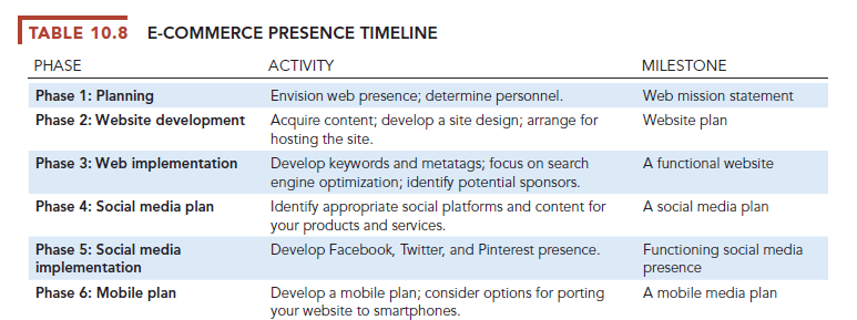 Where would you like to be a year from now? It’s very helpful for you to have a rough idea of the time frame for developing your e-commerce presence when you begin. You should break your project down into a small number of phases that could be completed within a specified time. Table 10.8 illustrates a one-year timeline for the development of an e-commerce presence for a start-up company devoted to fashions for teenagers. You can also find more detail about developing an e-commerce website in the Learning Tracks for this chapter.