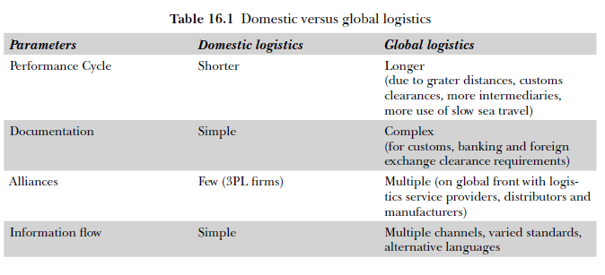As a consequence of globalization, managing logistics at the global level poses a challenge of considerable complexity. The complexity of this challenge varies with the nature of business and the operational environment. To face the logistical challenges there is no single standard solution available. The individual companies will have to understand both strategic and management issues to clearly know the implications that globalization of their business will have on logistics (see Table 16.1) operation of their company.