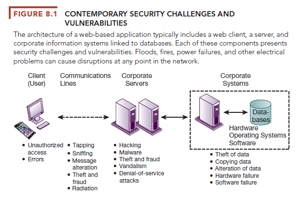 When large amounts of data are stored in electronic form, they are vulnerable to many kinds of threats. Through communications networks, information systems in different locations are interconnected. The potential for unauthorized access or damage is not limited to a single location but can occur at many access points in the network. Figure 8.1 illustrates the most common threats against contemporary information systems. They can stem from technical, organizational, and environmental factors compounded by poor management decisions. In the multitier client/server computing environment illustrated here, vulnerabilities exist at each layer and in the communications between the layers. Users at the client layer can cause harm by introducing errors or by accessing systems without authorization. It is possible to access data flowing over networks, steal valuable data during transmission, or alter data without authorization. Radiation may disrupt a network at various points as well. Intruders can launch denial-of-service attacks or malicious software to disrupt the operation of websites. Those capable of penetrating corporate systems can steal, destroy, or alter corporate data stored in databases or files.