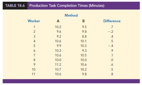 Consider a manufacturing firm that is attempting to determine whether two production methods differ in terms of task completion time. Using a matched-samples experimental design, 11 randomly selected workers completed the production task two times, once using method A and once using method B. The production method that the worker used first was randomly selected. The completion times for the two methods and the differences between the completion times are shown in Table 18.6. A positive difference indicates that method A required more time; a negative difference indicates that method B required more time. Do the data indicate that the two production methods differ significantly in terms of completion times? If we assume that the differences have a symmetric distribution but not necessarily a normal distribution, the Wilcoxon signed- rank test applies.