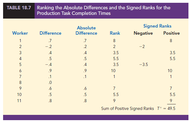 The first step in the Wilcoxon signed-rank test is to discard the difference of zero for worker 8 and then compute the absolute value of the differences for the remaining 10 workers as shown in column 3 of Table 18.7. Next we rank these absolute differences from lowest to highest as shown in column 4. The smallest absolute difference of .1 for worker 7 is assigned the rank of 1. The second smallest absolute difference of .2 for worker 2 is assigned the rank of 2. This ranking of absolute differences continues with the largest absolute difference of .9 for worker 6 being assigned the rank of 10.