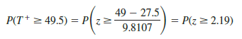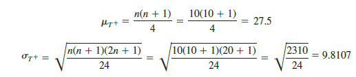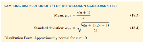 Let T+ denote the sum of the positive signed ranks, which is T+ = 49.5. To conduct the Wilcoxon signed-rank test, we will use T + as the test statistic. If the medians of the two populations are equal and the number of matched pairs is 10 or more, the sampling distribution of T + can be approximated by a normal distribution shown in equations (18.3) and (18.4).