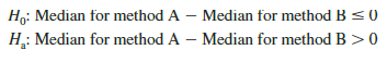 One-tailed Wilcoxon signed-rank tests are possible. For example, if initially we had been looking for statistical evidence to conclude method A had the larger median completion time and method B has the smaller median completion time, we would have formulated an upper tail hypothesis test as follows: