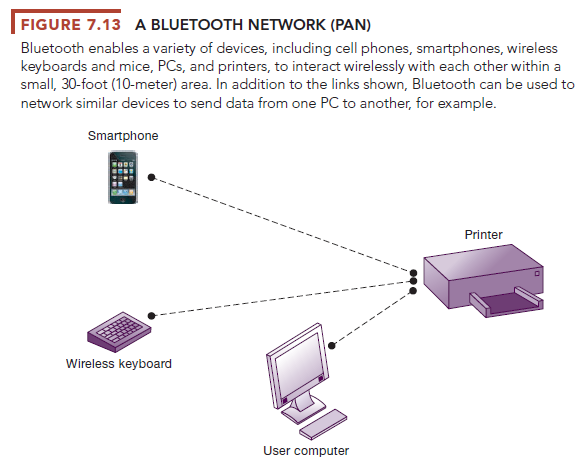 Wireless phones, pagers, computers, printers, and computing devices using Bluetooth communicate with each other and even operate each other without direct user intervention (see Figure 7.13). For example, a person could direct a notebook computer to send a document file wirelessly to a printer. Bluetooth connects wireless keyboards and mice to PCs or cell phones to earpieces without wires. Bluetooth has low power requirements, making it appropriate for battery-powered handheld computers or cell phones.