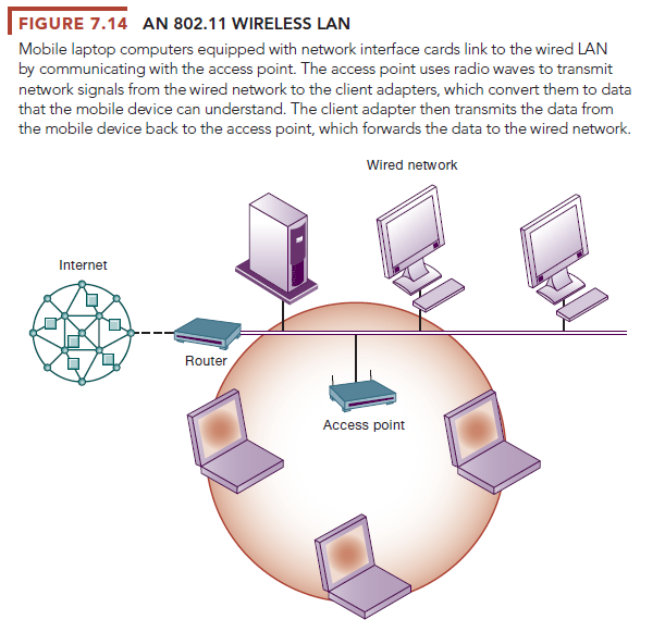 Figure 7.14 illustrates an 802.11 wireless LAN that connects a small number of mobile devices to a larger wired LAN and to the Internet. Most wireless devices are client machines. The servers that the mobile client stations need to use are on the wired LAN. The access point controls the wireless stations and acts as a bridge between the main wired LAN and the wireless LAN. The access point also controls the wireless stations.