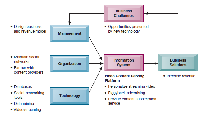 The chapter-opening diagram calls attention to important points raised by this case and this chapter. YouTube’s primary business challenge is how to take advantage of opportunities presented by the Internet and new developments in search and data mining technology to wring profits from the billions of videos it streams to viewers. Obviously YouTube had to make major investments in technology to support video uploads and downloads, gigantic databases of videos and users, tagging images, and social networking tools. YouTube generates revenue from ads targeted to video viewers and from subscriptions to its streaming content services, including its new lineup of major TV channels. It is unclear whether YouTube has achieved long-term profitability, but it is very valuable to Google as another outlet for its advertising.